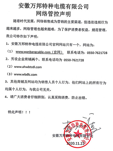 鄭重聲明:安徽萬邦特種電纜有限公司官方網站為:www_wanbangcable_com.euxkjbz.cn,除此之外無任何子網站或合作網站,其余均為假冒偽劣。電話:0550-7621728 13485756353 地 址:安徽省天長市滁州高新技術產業開發區經四路29號